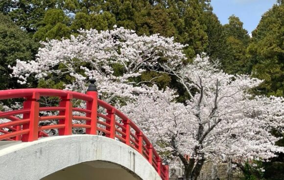 赤いアーチ橋の花々とホタルの噂