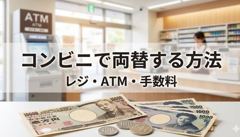 レジでの直接両替は断られるのが当たり前。ATM手数料(110円〜)を惜しまないか、買い物を伴う。