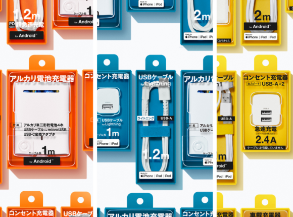スマホ利用者が多いため、ケーブル類は「スマホアクセサリー棚」にぎっしりと並んでいることが多いです。